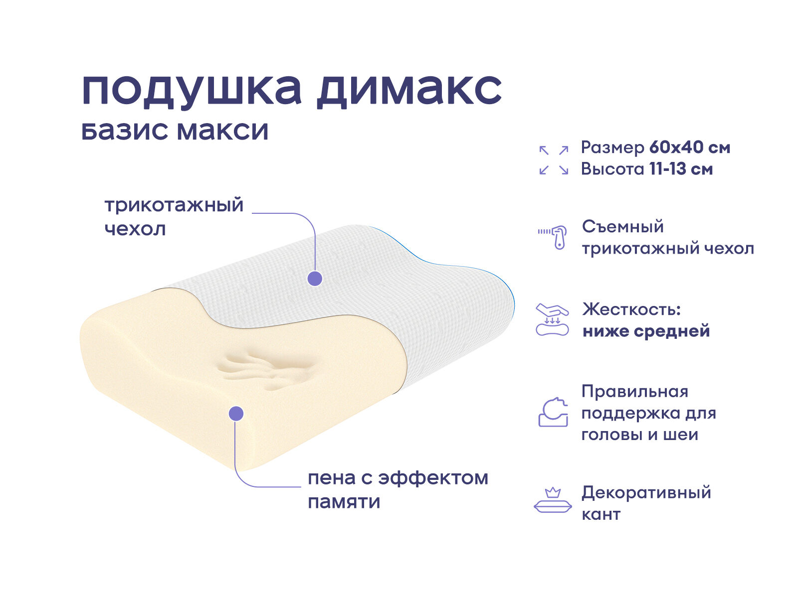 Подушка получила продуманную волнообразную форму с двумя валиками разной высоты – 11 и 13 см, которая учитывает анатомию человека и создаёт правильную поддержку. Модель адаптивна и легко подстраивается под разное телосложение. Наполнителем выступает вязко-эластичная пена мемори – особый вид материала, который под воздействием тепла и давления способен запоминать изгибы тела. Подушка эргономичной формы позволяет разгрузить верхний отдел позвоночника, бережно поддерживая шею и голову, что даёт быстрое расслабление и улучшает качество сна.
