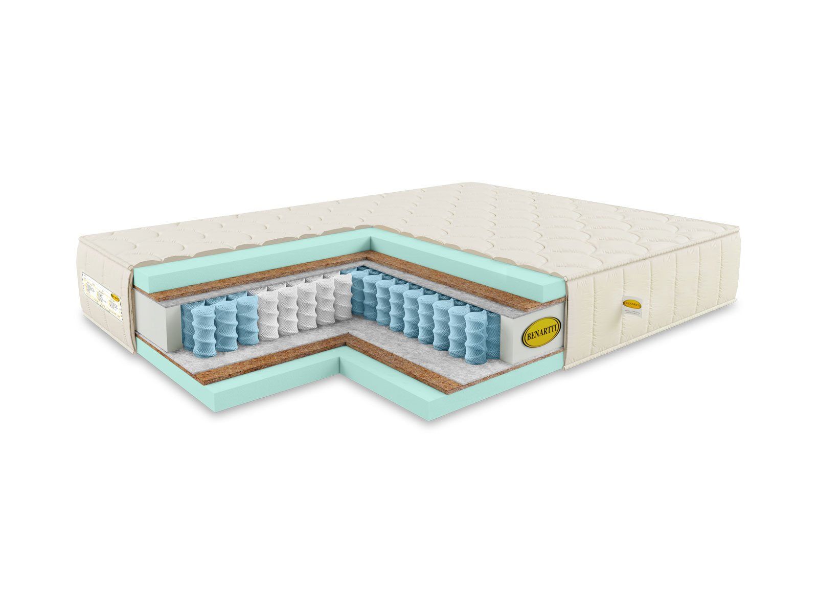 Порядок наполнителей не случаен. Сразу за пружинным блоком следует кокосовая койра. Благодаря своей высокой жёсткости и плотности она отлично передаёт и продолжает ортопедические особенности пружин. Толстый слой латекса, следующий за койрой, обеспечивает комфорт и приятную упругость. Материал дает поверхностям эластичность и адаптивность, которые позволяют повторять все изгибы тела.