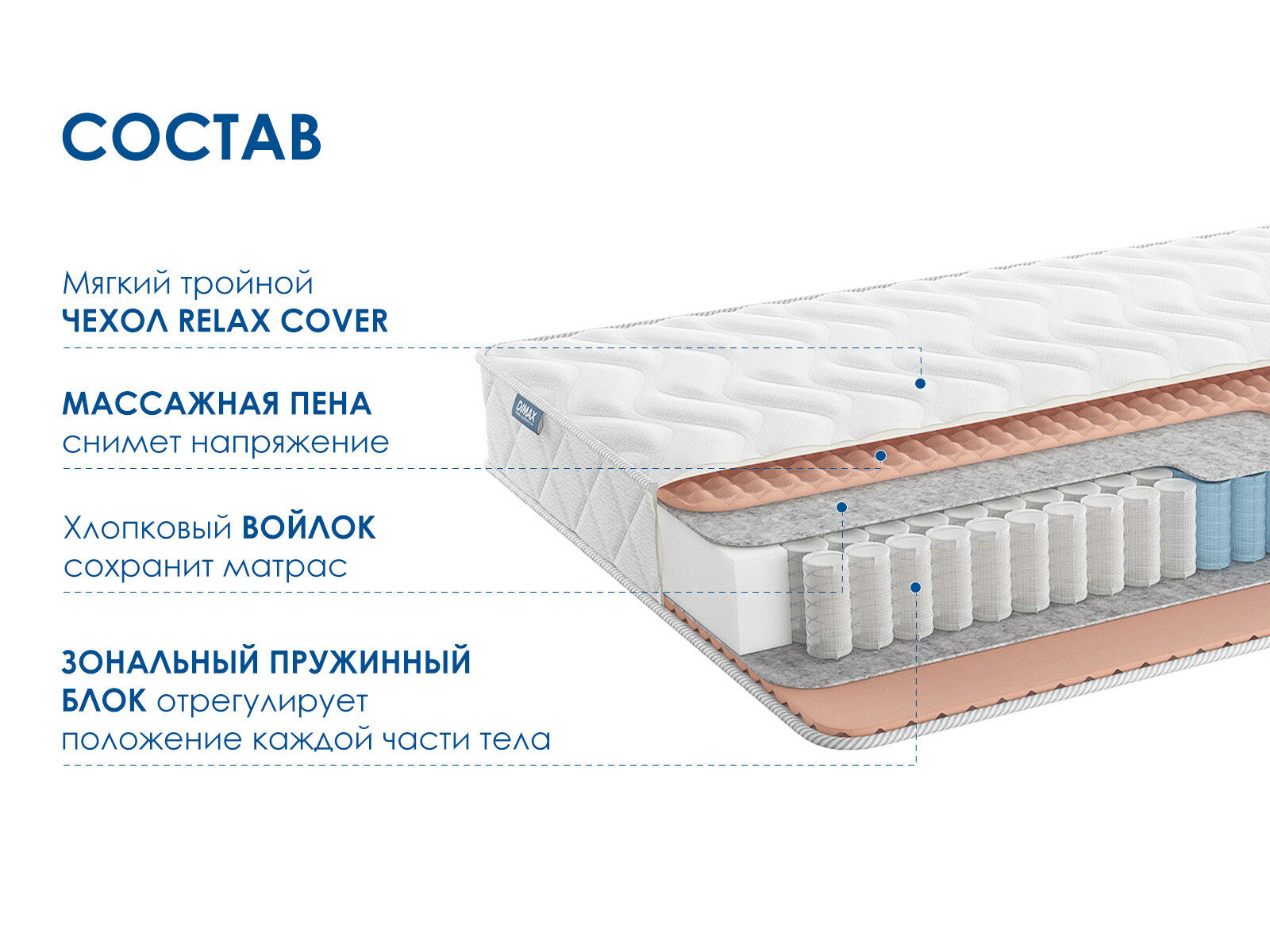 Массажный матрас Димакс Relmas Light 3Zone – мягкая и пружинная модель. Матрас создан для глубокого расслабления и улучшения кровообращения благодаря массажному чехлу и зональной поддержке.
