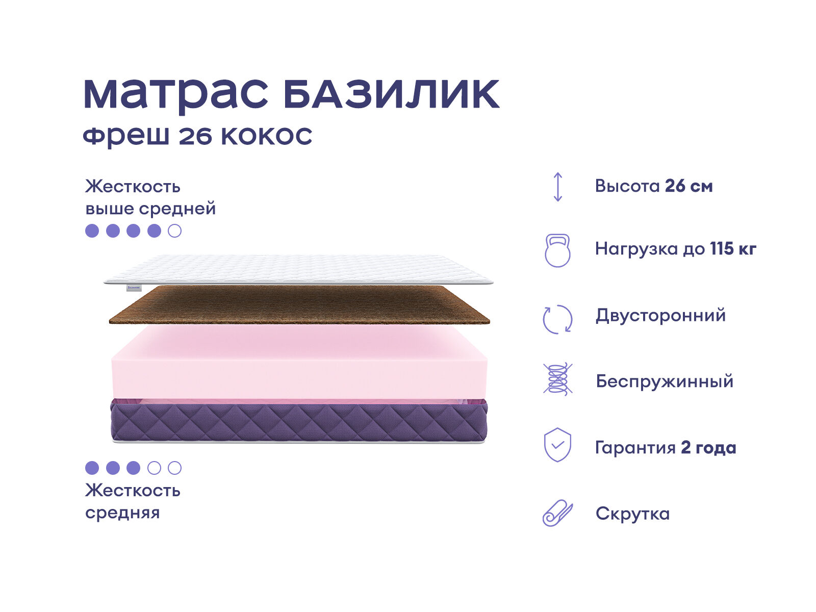 Этот беспружинный матрас представляет собой сбалансированное решение для всех, кто заботится о здоровье осанки. С оптимальной жёсткостью, двумя спальными поверхностями и натуральной кокосовой койрой он обеспечивает комфортный и здоровый сон для тех, кто ищет «золотую середину» в матрасе.