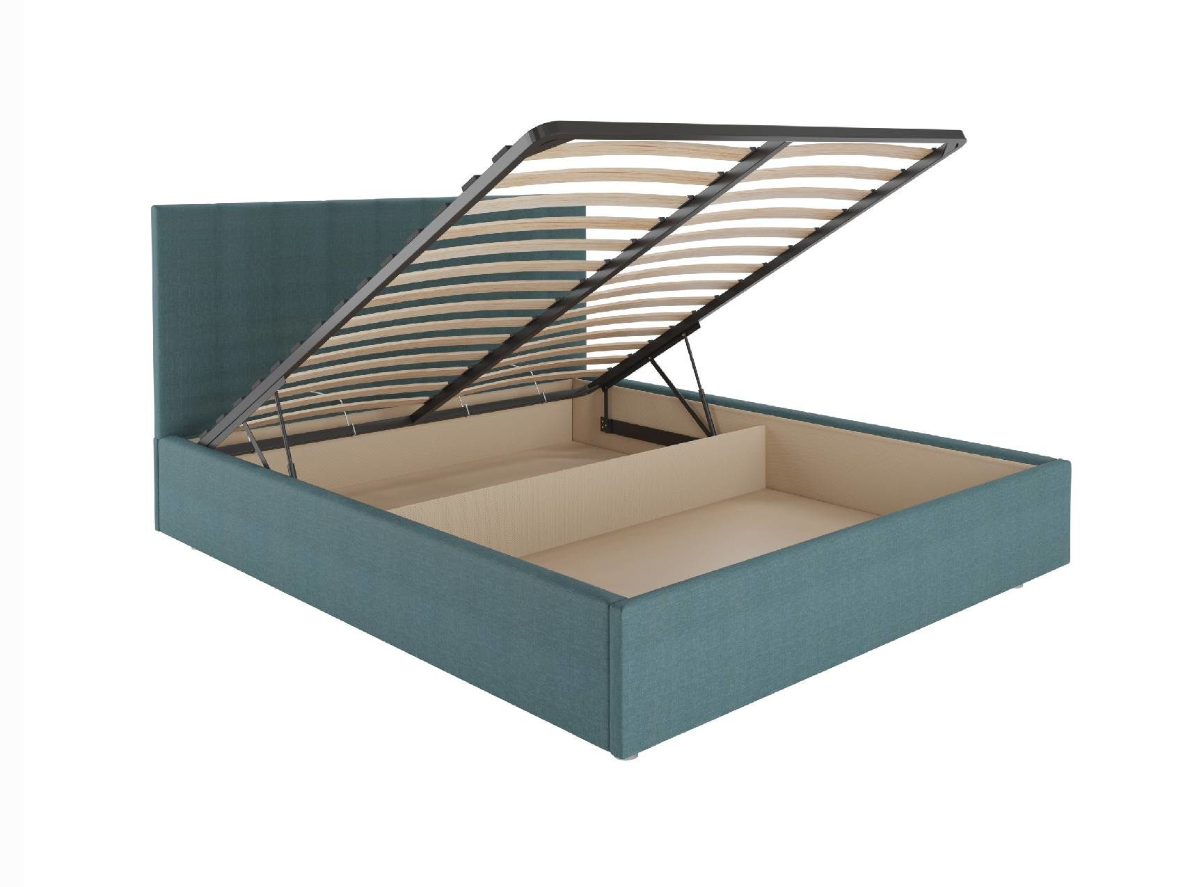 Кровать укомплектована металлическим основанием с подъемным механизмом. Такое решение подойдёт для тех, кто хочет получить дополнительное место для хранения. Просторный бокс под основанием позволяет складывать объёмные одеяла, постельное бельё и сезонные вещи.