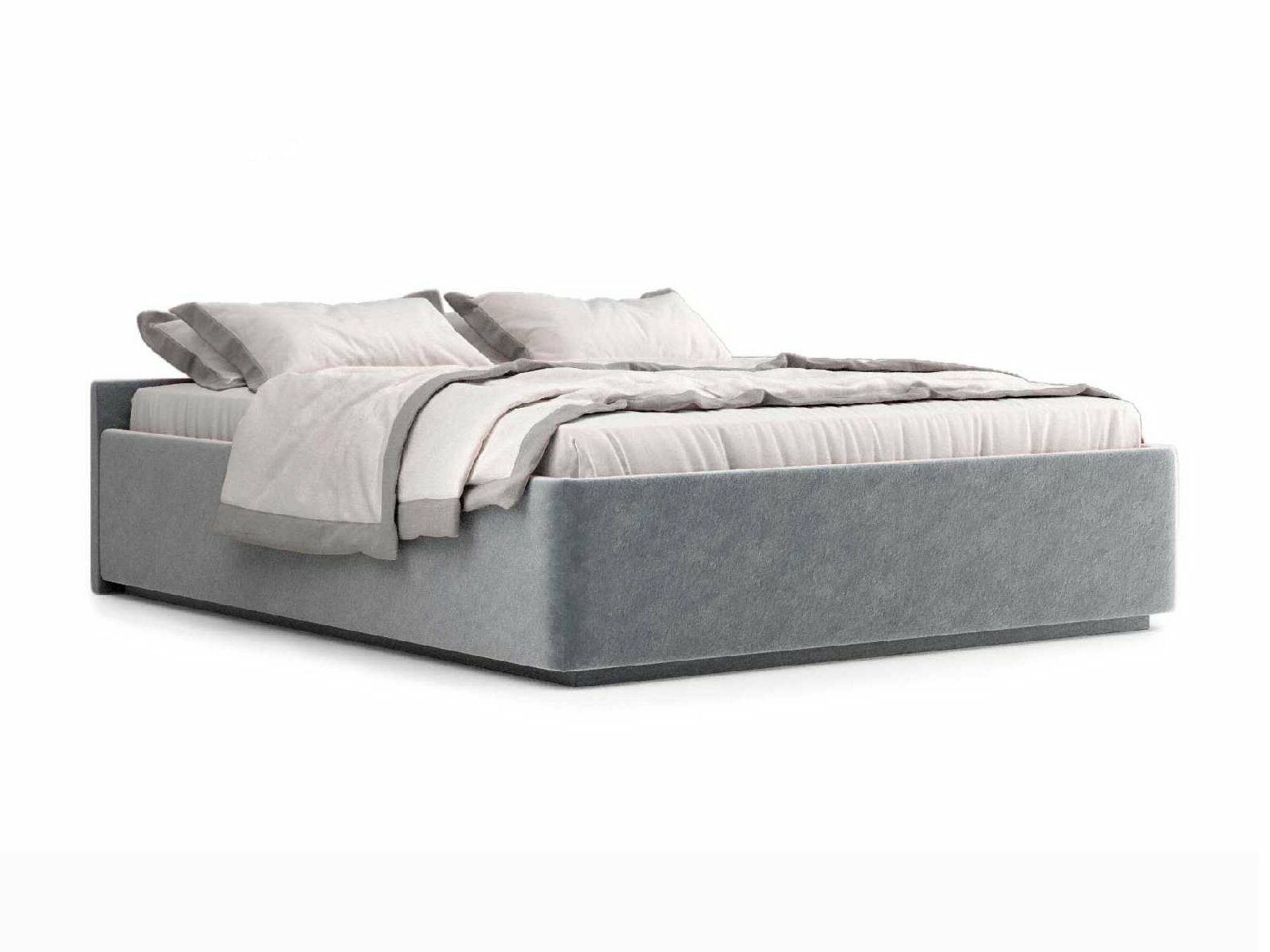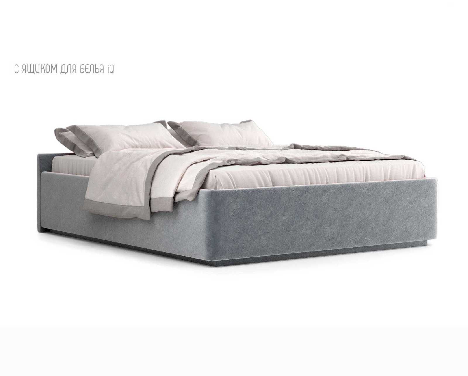 Кровать укомплектована IQ с подъемным механизмом и ящиком для белья без дна (дополнительная платная опция - дно к ящику IQ из HDF (ХДФ). Каркас кровати на цоколе, декоративный чехол на цоколе съёмный. Глубина ящика для белья - 30 см, без ограничения нагрузки на ящик.