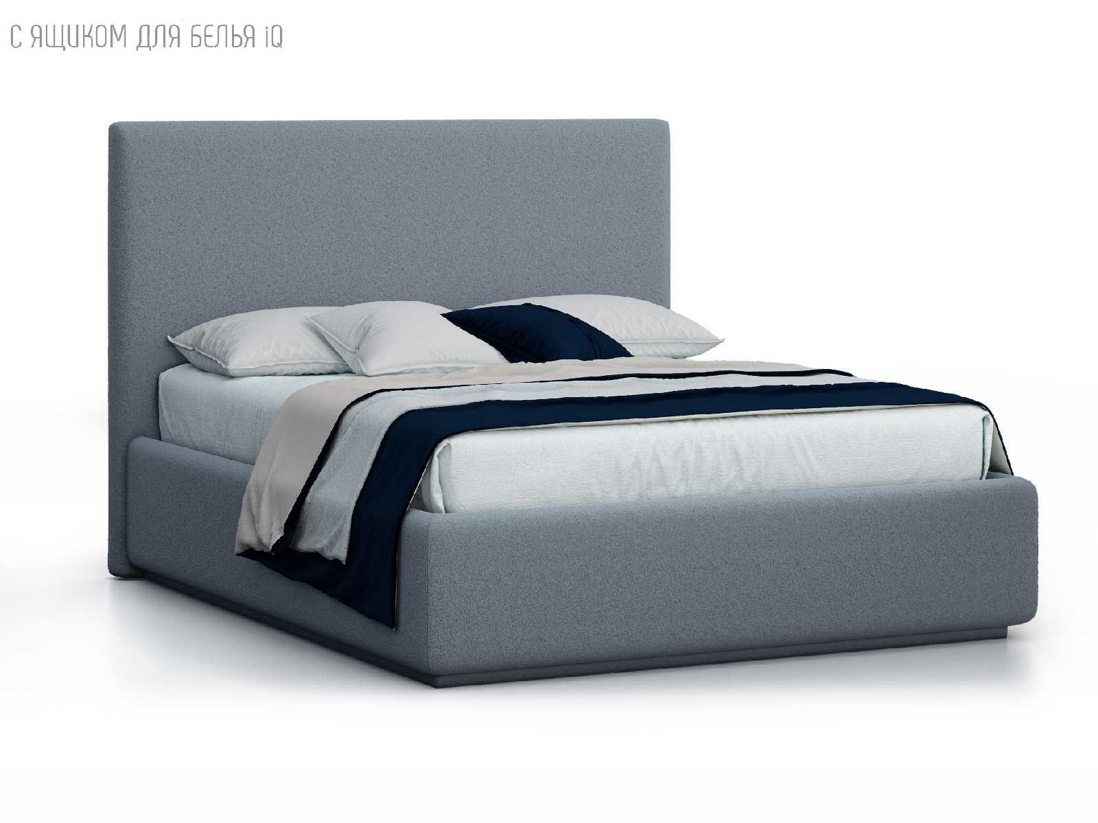Кровать укомплектована IQ с подъемным механизмом и ящиком для белья без дна (дополнительная платная опция - дно к ящику IQ из HDF (ХДФ). Каркас кровати на цоколе, декоративный чехол на цоколе съёмный. Глубина ящика для белья - 30 см, без ограничения нагрузки на ящик.