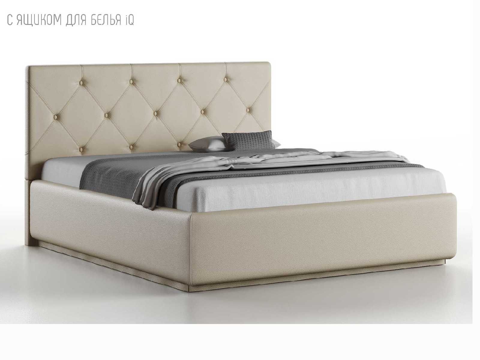 Кровать укомплектована IQ с подъемным механизмом и ящиком для белья без дна (дополнительная платная опция - дно к ящику IQ из HDF (ХДФ). Каркас кровати на цоколе, декоративный чехол на цоколе съёмный. Глубина ящика для белья - 30 см, без ограничения нагрузки на ящик.