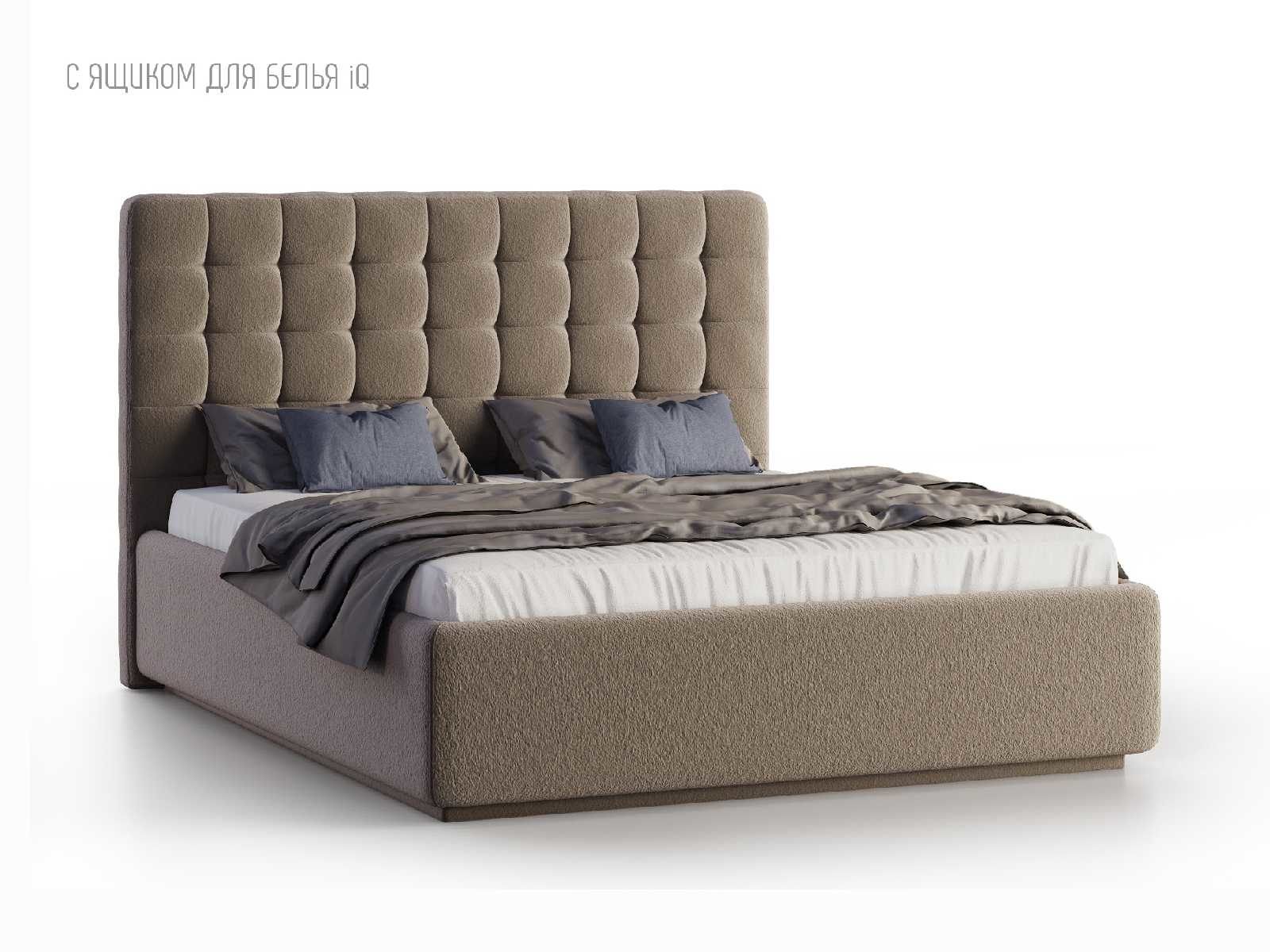 Кровать укомплектована IQ с подъемным механизмом и ящиком для белья без дна (дополнительная платная опция - дно к ящику IQ из HDF (ХДФ). Каркас кровати на цоколе, декоративный чехол на цоколе съёмный. Глубина ящика для белья - 30 см, без ограничения нагрузки на ящик.