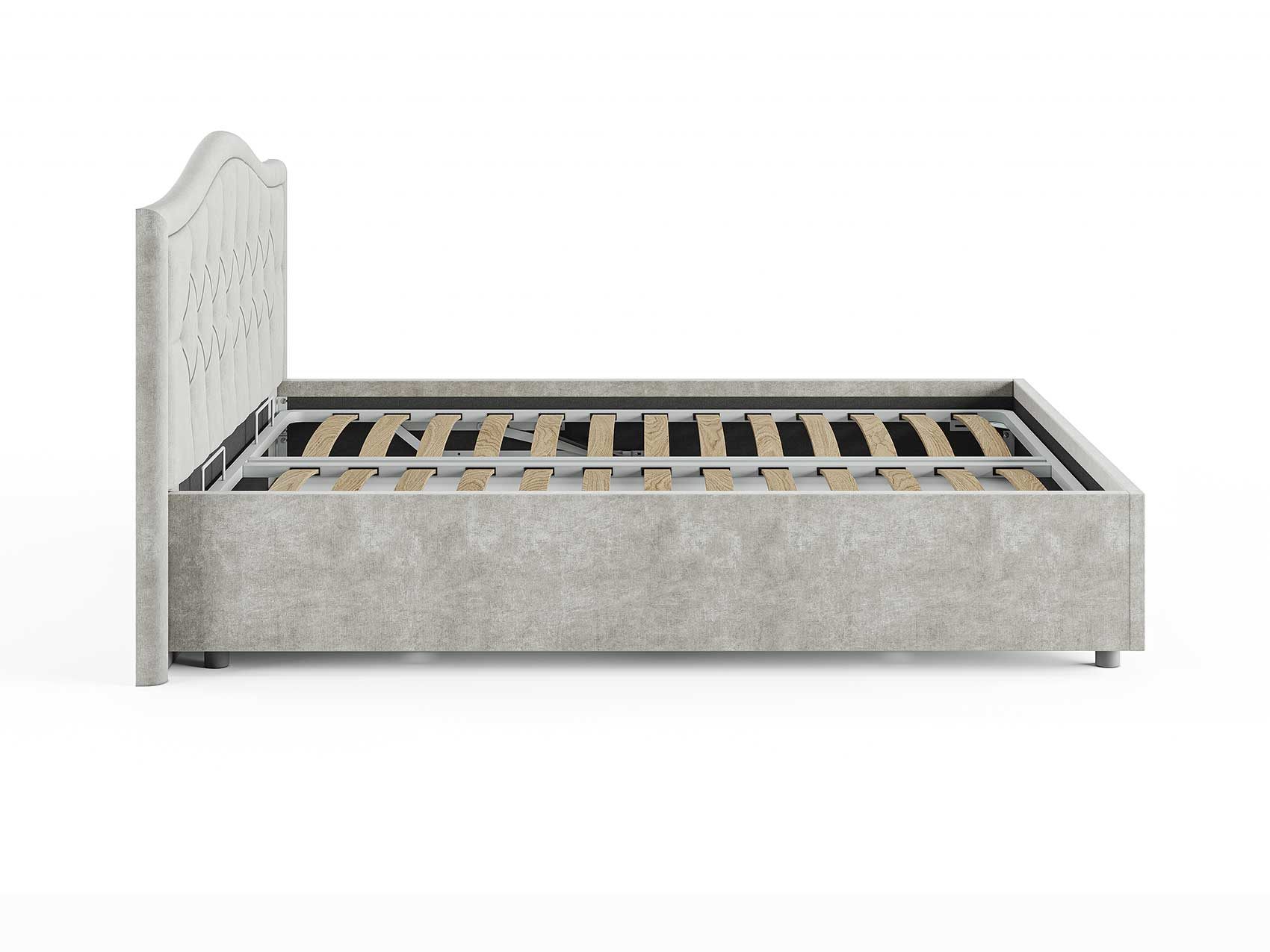 Кровать комплектуется металлическим основанием (без опор), которое имеет 13 рядов встроенных березовых ламелий на каждое спальное место, обеспечивая равномерное распределение нагрузки.