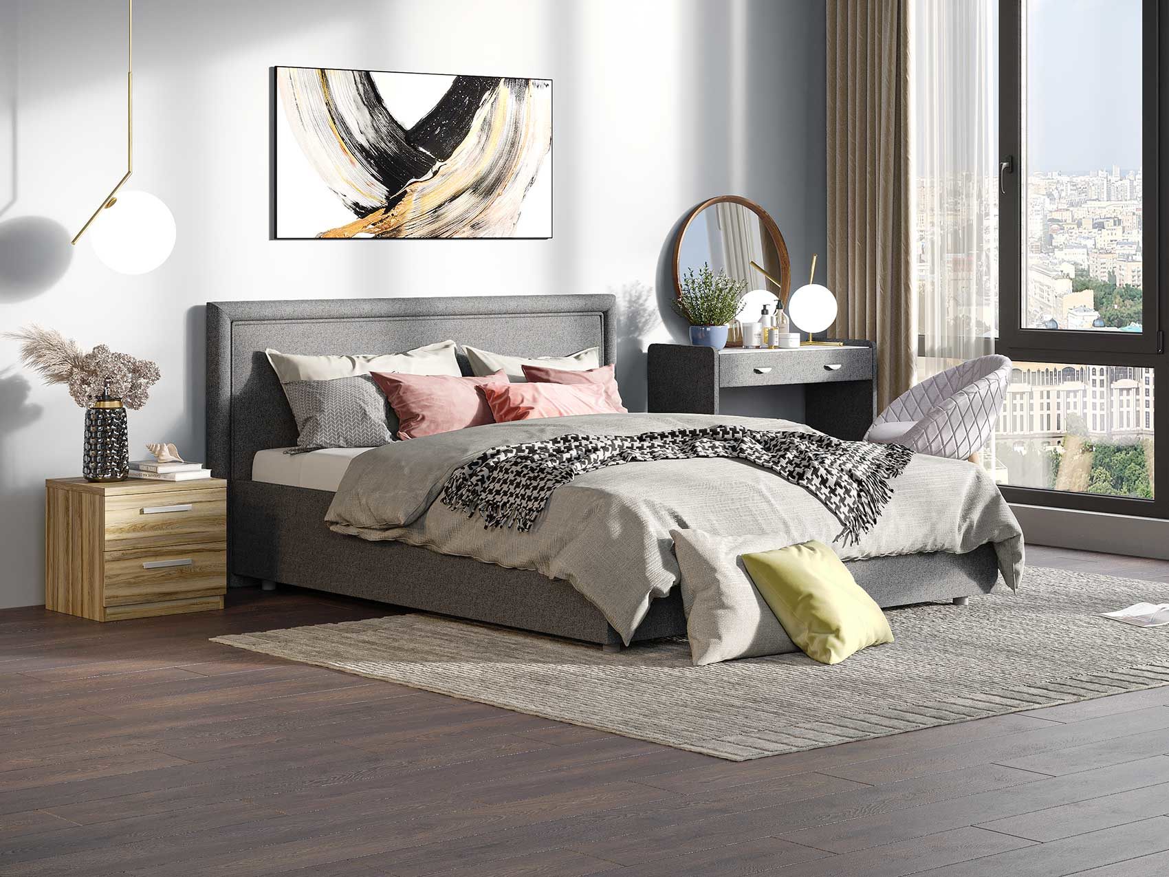 Элегантная интерьерная кровать с мягким изголовьем. Модель изготовлена из ДСП. Обратная сторона изголовья обита спандбондом, но её можно выполнить из основного обивочного материала.