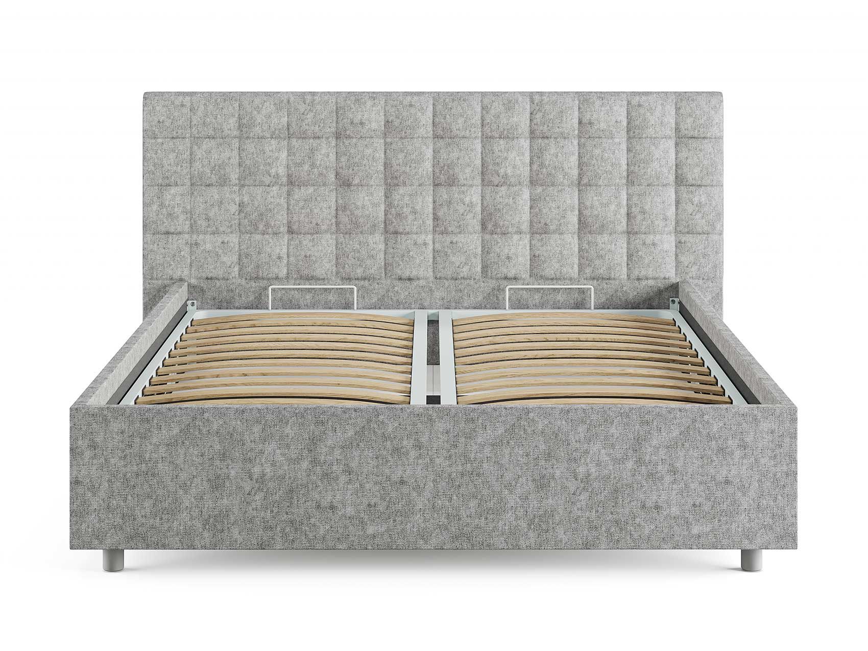 Кровать комплектуется металлическим основанием (без опор), которое имеет 13 рядов встроенных березовых ламелий на каждое спальное место, обеспечивая равномерное распределение нагрузки.