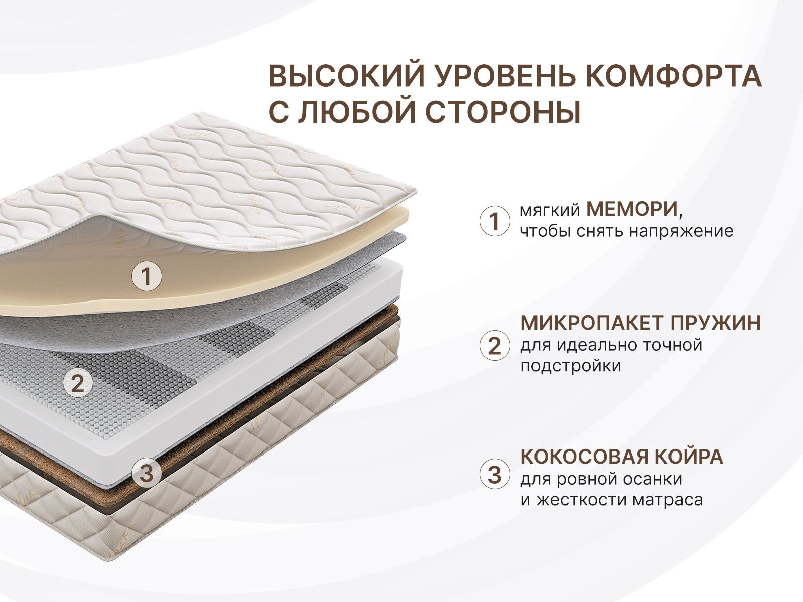Пружинный матрас с эффектом памяти Микро Мемо Хард. Модель имеет две различные по жёсткости поверхности: жесткую и мягкую. Если вы предпочитаете максимальный комфорт и уютное спальное место, то вам подойдёт мягкая адаптивная сторона с пеной Мемори, а если вы любите высокую жёсткость, то поверхность с койрой кокоса станет наиболее оптимальным выбором.