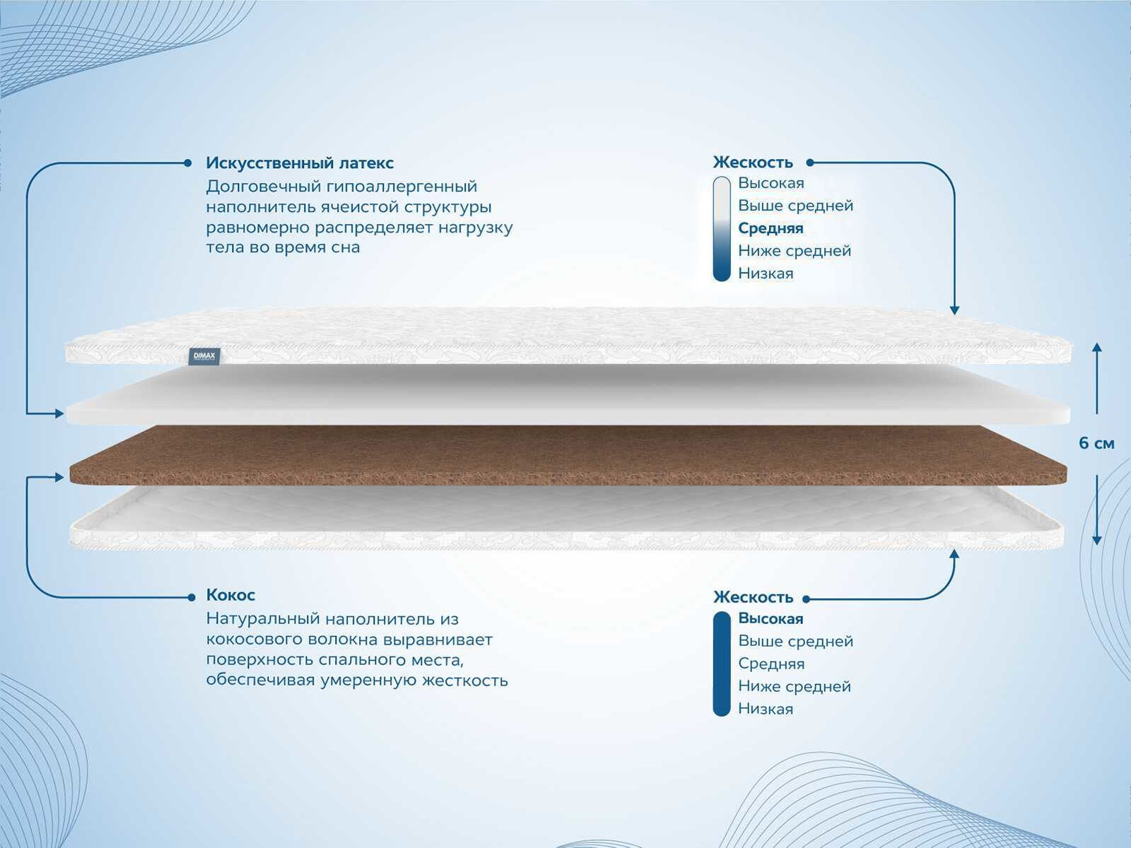 Ортопедический наматрасник Димакс Искусственный Латекс 3 см + Кокос 3 см — это топпер, выравнивающий неровности основной спальной поверхности и придающий дополнительный уровень комфорта месту для сна. Модель идеально сочетает мягкость и поддержку, обеспечивая оптимальные условия для полноценного отдыха.