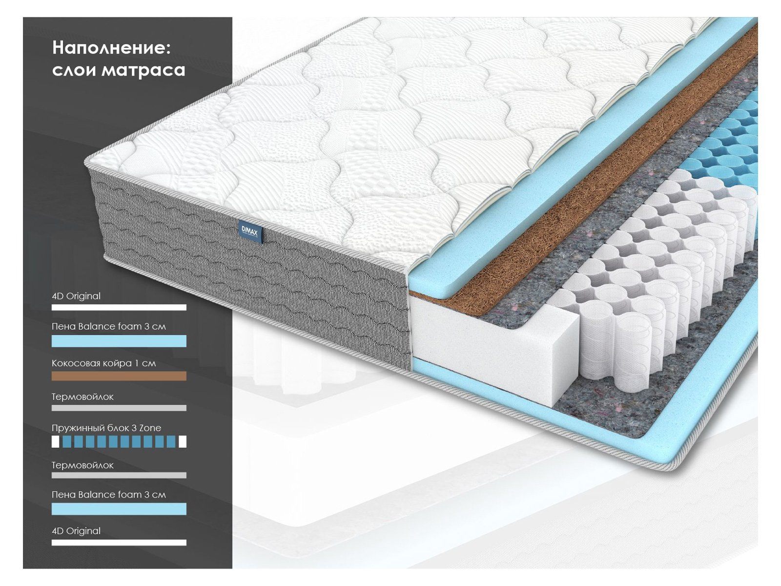 Димакс ОК Лайт Базис – это ортопедический матрас высотой 22 см, рассчитанный на нагрузку до 120 кг. Он сочетает независимый пружинный блок 3 Zone с комбинированными наполнителями и создаёт оптимальную поддержку для комфортного сна.