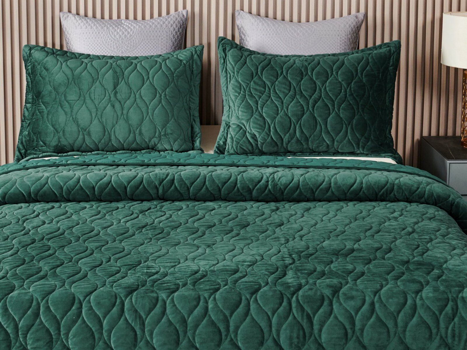 Покрывала и наволочки изготовлены из велюра высокой плотности - приятной на ощупь бархатистой ткани с коротким ворсом. Пошив покрывала с кантом, наволочки с ушками 5 см.