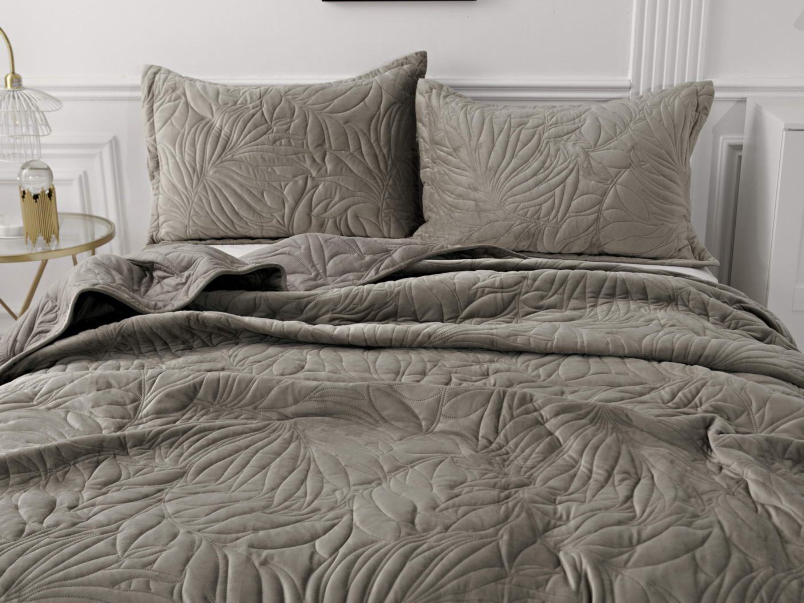 Стёганое покрывало Глория изготовлено из 100% вискозы, что делает его невероятно мягким и комфортным. Рисунок напоминает листья лавра. Такой орнамент подойдет большинству современных интерьеров.