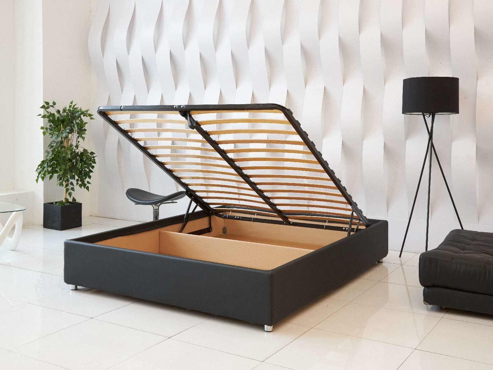 В комплектации с подъемным механизмом кровать имеет вместительный бельевой короб с двумя отделениями.