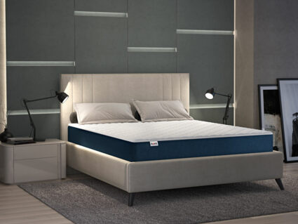Чехол матраса примечателен аккуратным синим бурлетом, который придаёт спальной принадлежности стильный внешний вид.